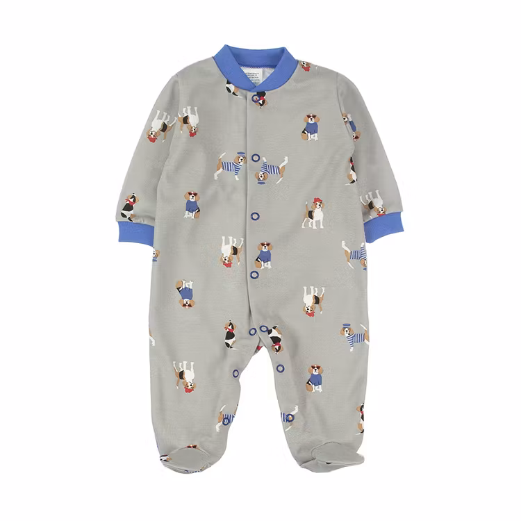 Långärmad sparkdräkt med hundar från kollektionen Classy Dogs. Sparkdräkten har tryckknappar från kragen till benen samt hela fötter.