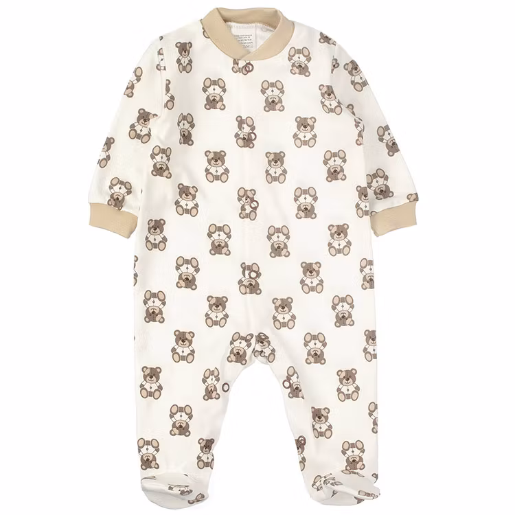 Bli förälskad i den charmiga och praktiska cremevita sparkdräkten med hela fötter och nallemönster. Dräkten är gjord av mjuk och hudvänlig bomull.