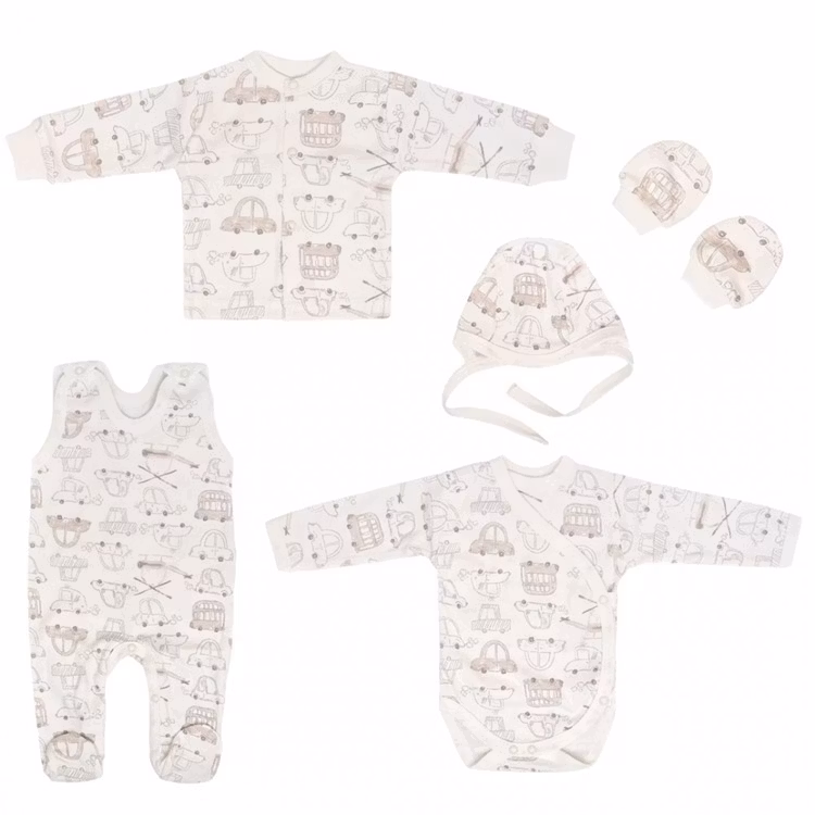 Startpaket i fem delar med mönster av bilar från kollektionen Cars. Tröja, body, sparkdräkt, vantar och mössa i bomull.