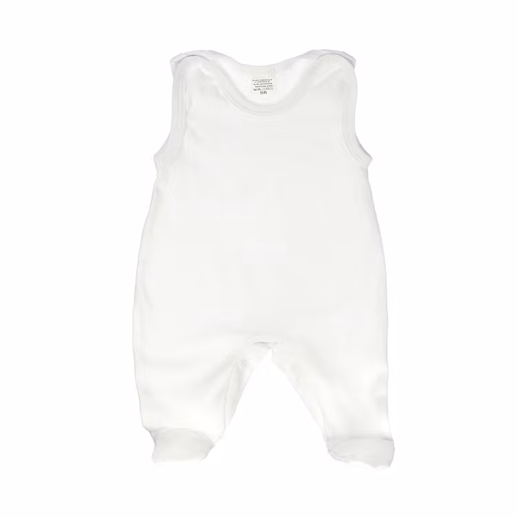 Vit ärmlös sparkdräkt från kollektionen Baby White. Sparkdräkten har hela fötter och tryckknappar vid axlar, gren och ben.