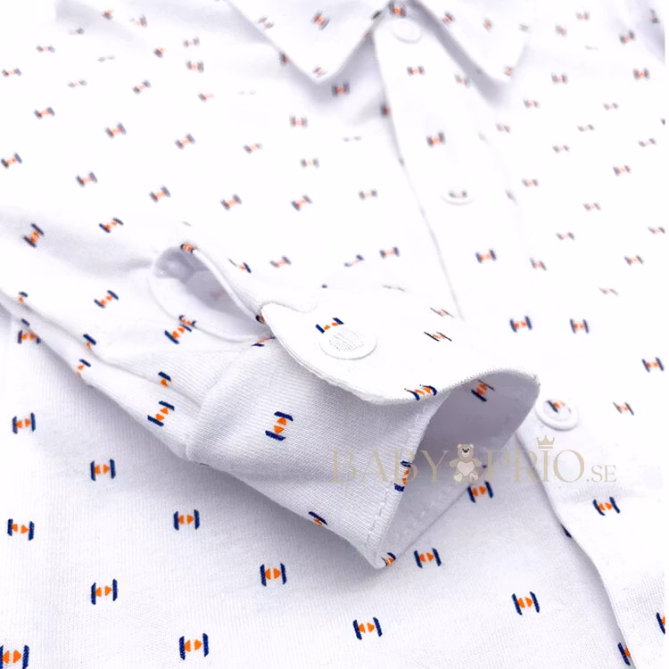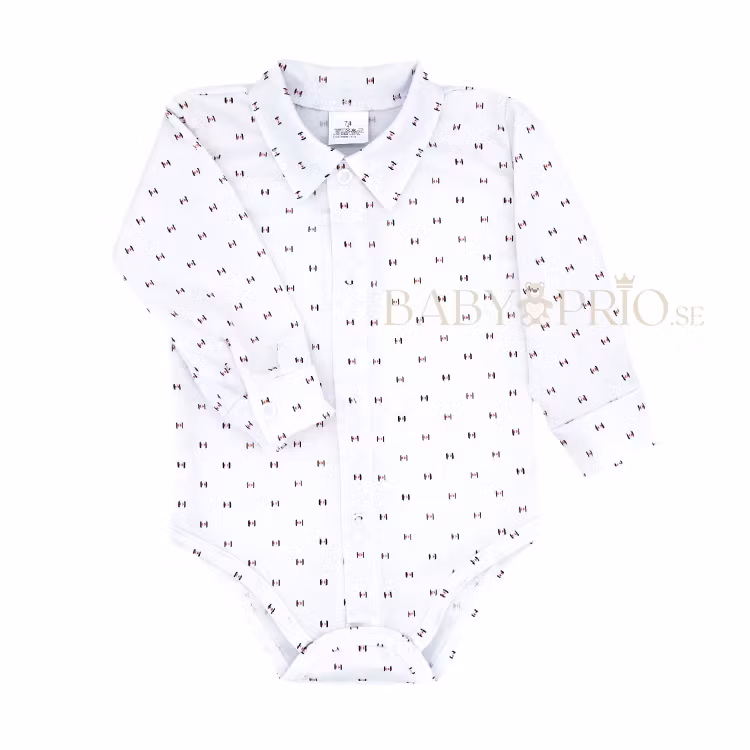 Mjuk vit skjortbody med mönster från kollektionen Ellegance. Bodyn har tryckknappar vid ärmslut samt från krage till gren.